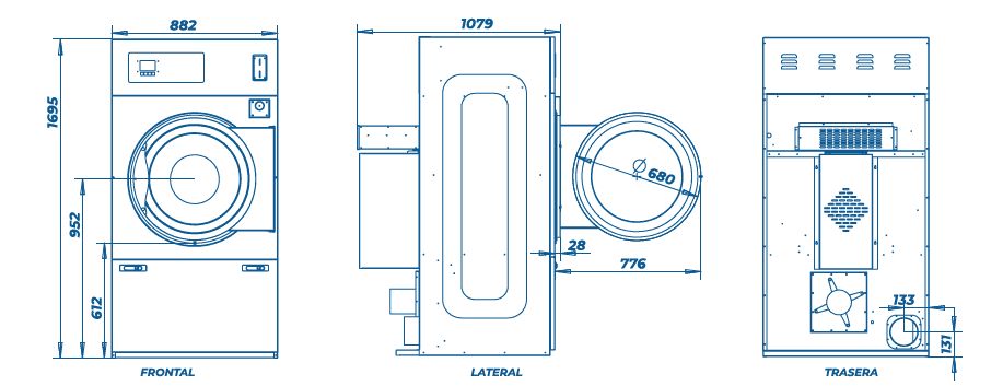 Secadora industrial de carga frontal con sistema de calefacción por Vapor (S). Su diseño robusto y control inteligente facilitan la operación y aseguran un secado rápido y uniforme.