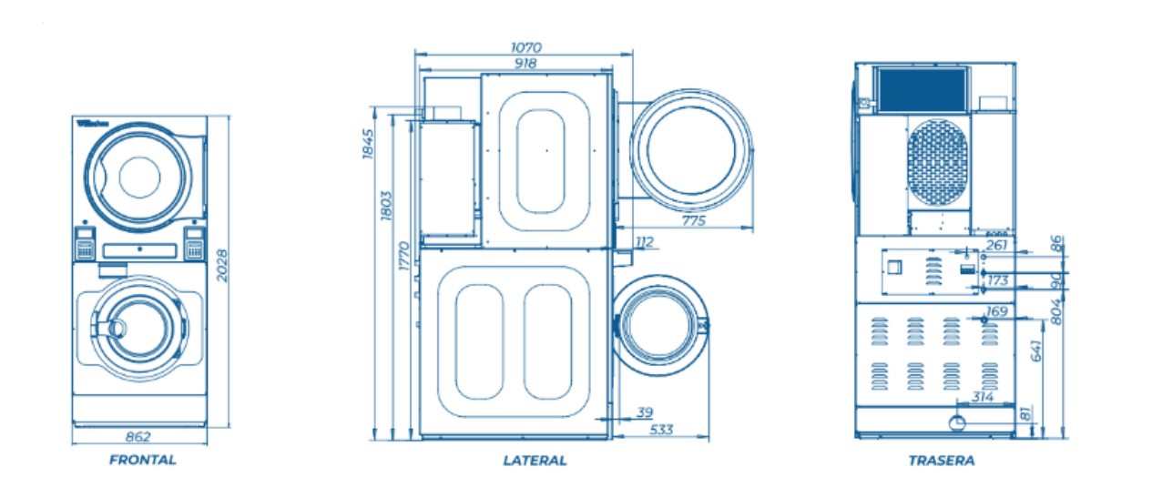 Secadora industrial apilable (Stack Dryer) diseñada para maximizar el espacio en lavanderías de alto consumo sin comprometer la capacidad ni el rendimiento. Utiliza calefacción de Gas (G) y ofrece doble capacidad en la huella de un solo equipo.